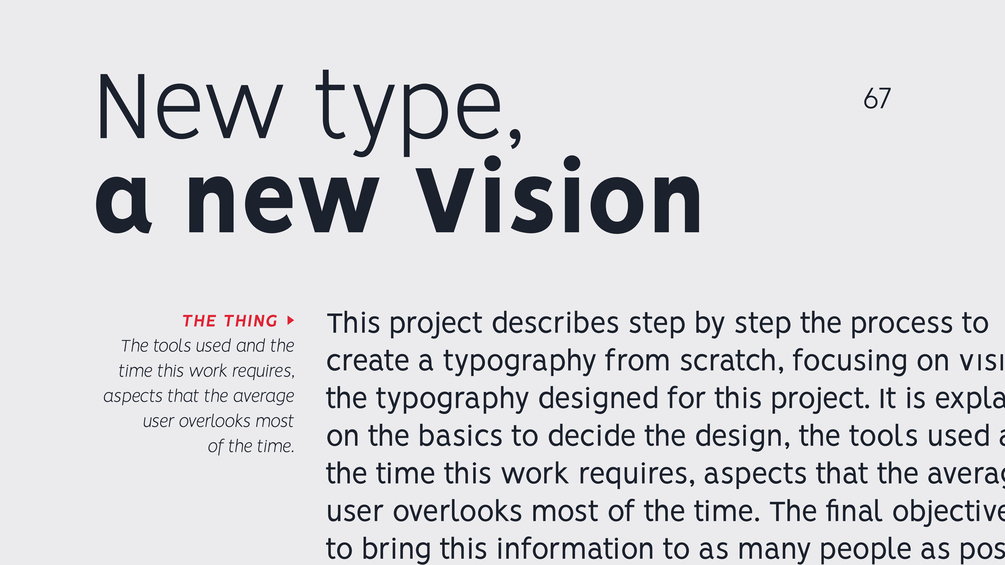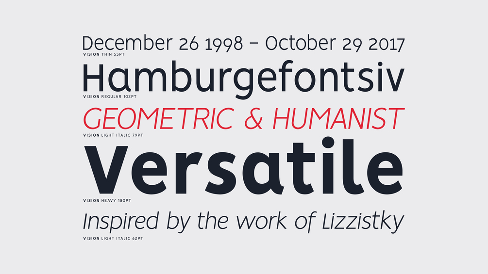 Vision is a clean, geo-humanist sans Font family of 12 fonts, it’s design started as an exploration of geometric forms from early 20th century lissitzky’s prouns, perfect for display and small text, it’s born to be versatile, a clear and modern Font with great legibility in large and short texts. in addition, it has an extended ligatures, opentype features and alternatives glyphs which provide flexibility and uniqueness wherever it is placed.